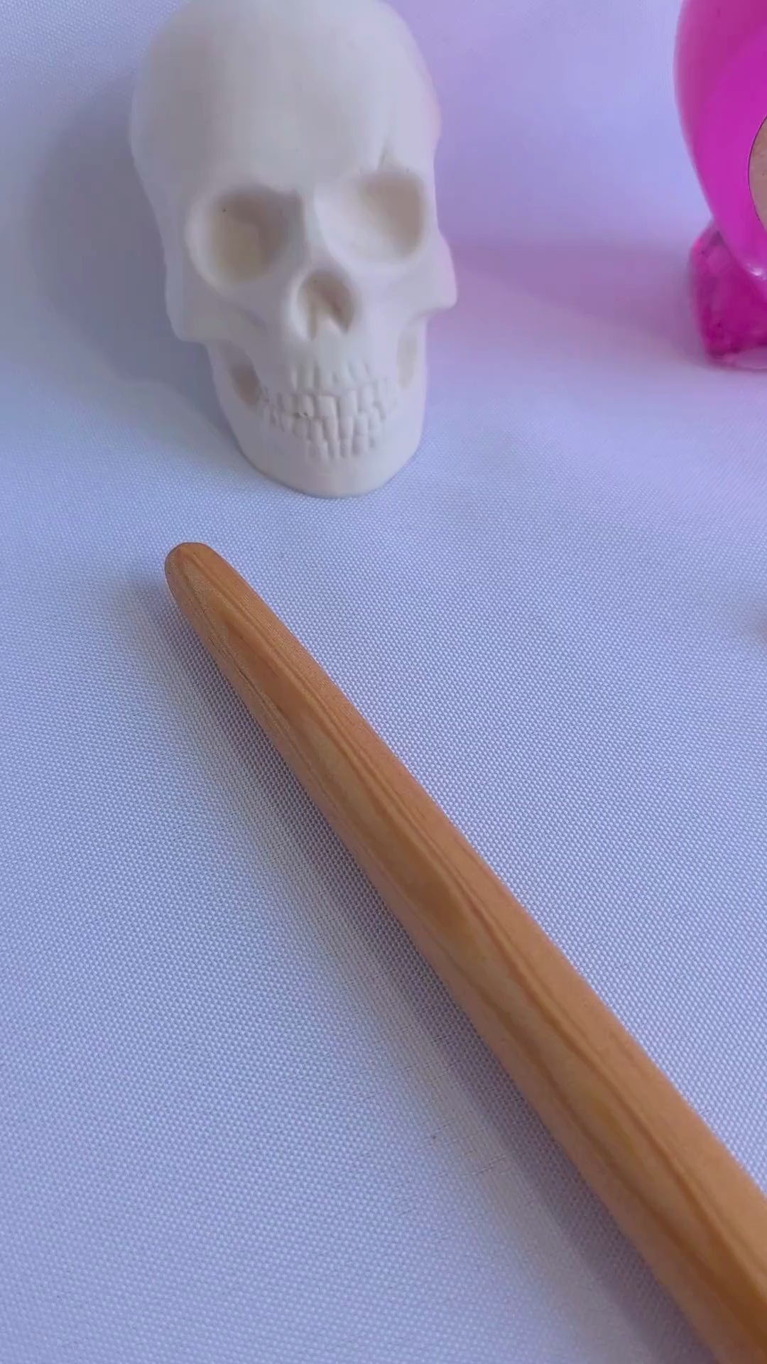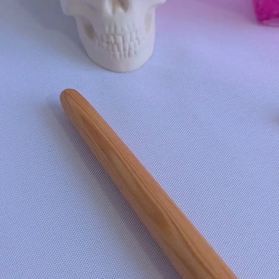 Shaped from wood and painted by hand, the wand’s form is deliberately organic rather than uniform. The rose quartz inset is not decorative afterthought—it is placed as a grounding element, inviting the wielder to hold intention close rather than project it outward. The wand is sealed with beeswax, softening the finish and lending a natural warmth to the grip.