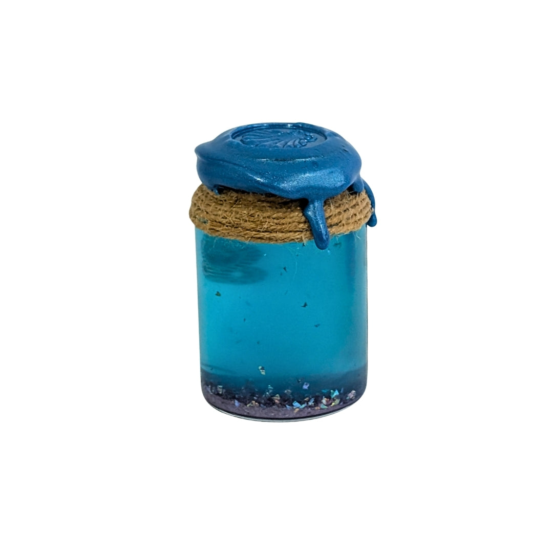 At rest, the elixir appears a calm, translucent blue. When shaken, it blooms into violet tones - an intentional transformation meant to echo emotional tides, hidden depth, and unspoken power. Fine shimmer and suspended fragments catch the light, giving the potion a living, liquid presence.