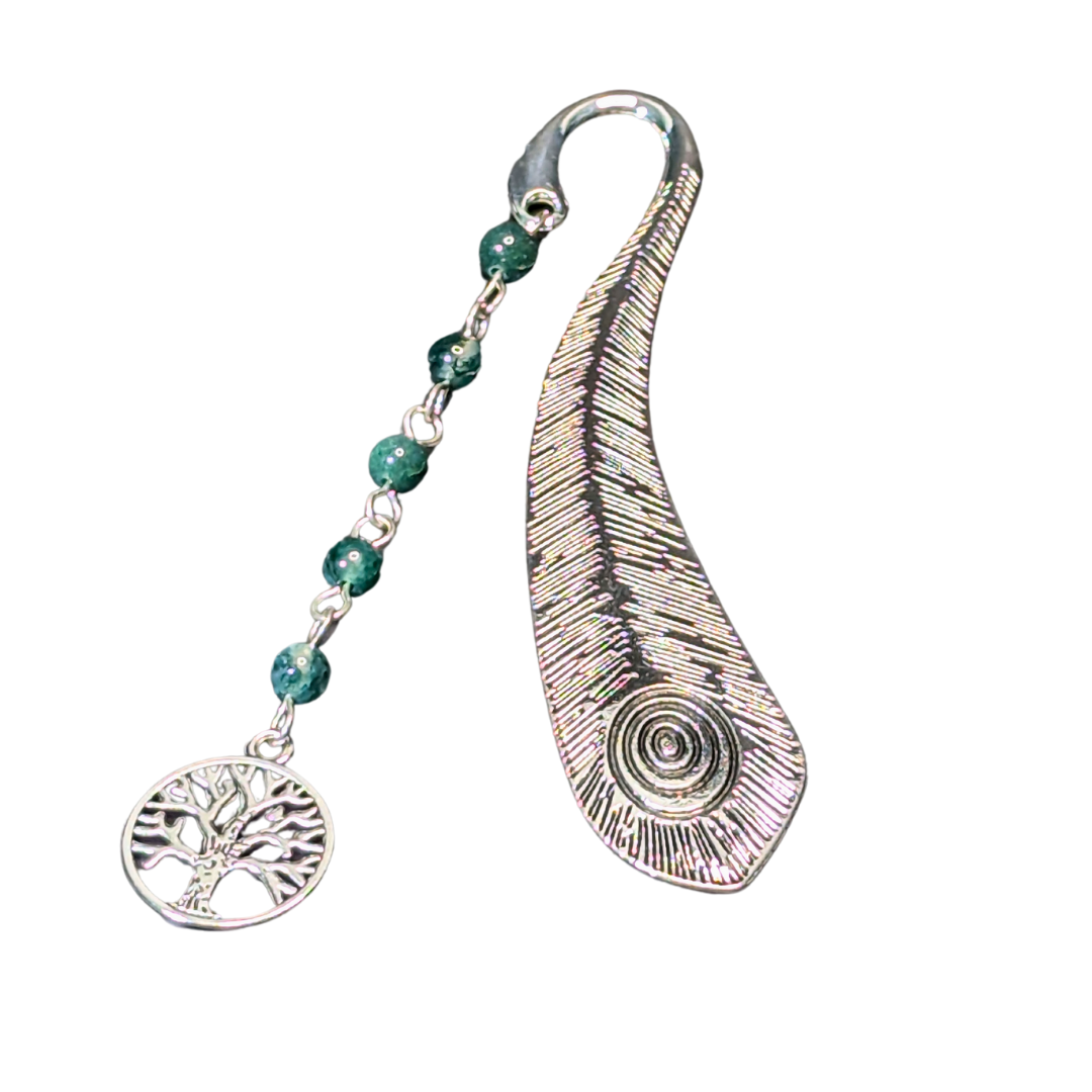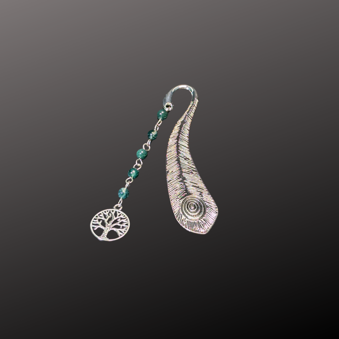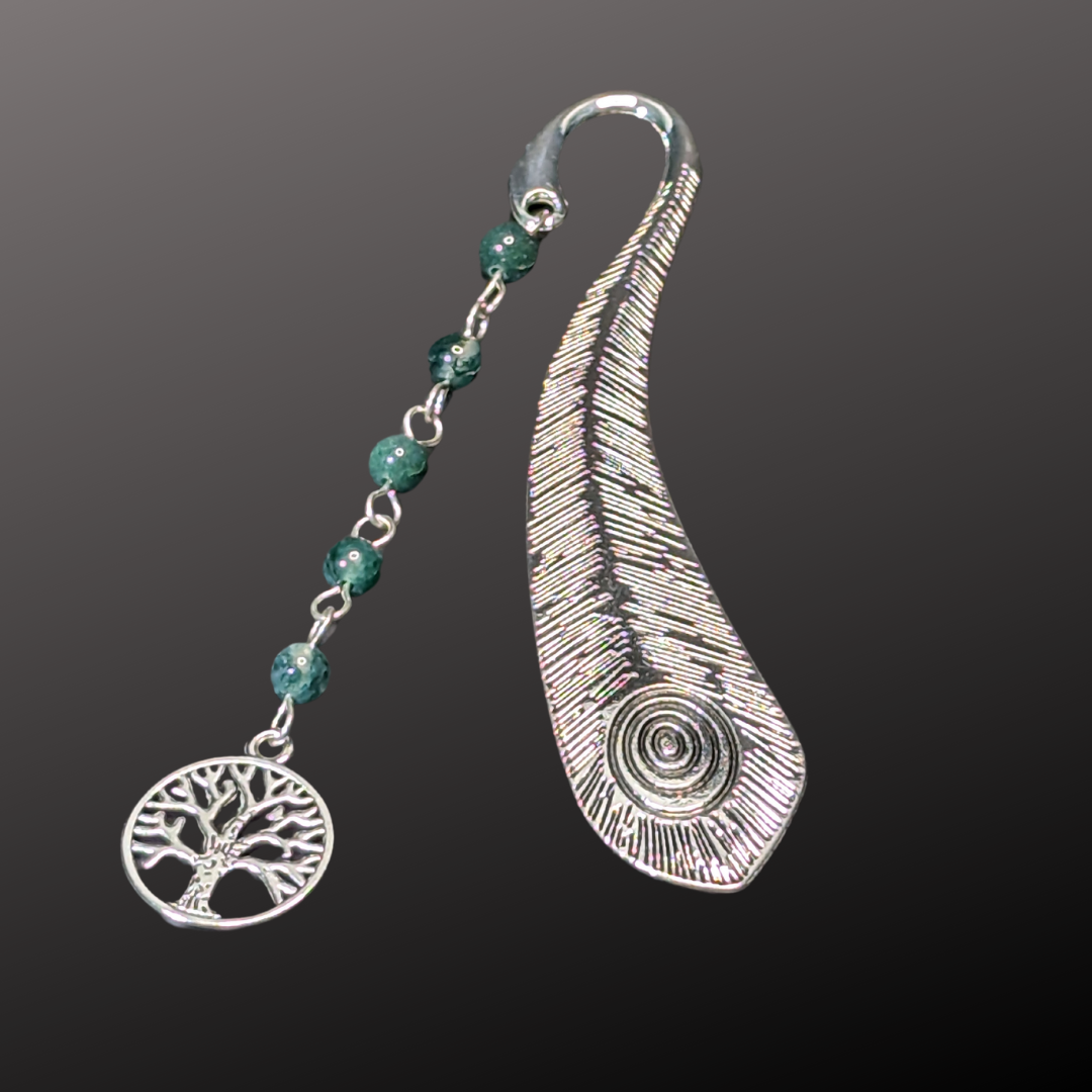 Connect with the timeless essence of storytelling with our tree of life bookmark. This 10 cm hook-top metal feather is beautifully hand-crafted with 8 mm moss agate beads, bringing the calmness of nature to your reading moments.
